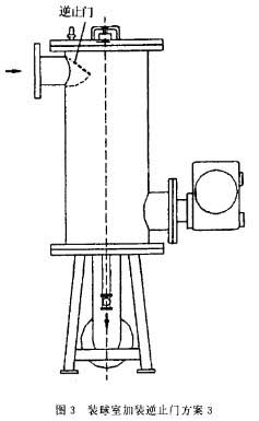 A)考慮以下3種方案:在原系統管路中裝球室入口處增加能夠實現逆止功能的止回閥。根據系統壓力及膠球循環管路通徑,可選用H44)-6型旋啟式止回閥。其優點是:不需要對現有裝球室做任何改動,巳逆止效果好,但缺點是增加了系統中的閥門,成本增加較多,而且因閥門安裝在系統管路上,不能將膠球完全阻隔于裝球室內。