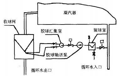 膠球清洗,凝汽器膠球清洗裝置系統(tǒng)由膠球泵、裝球室、分匯器、收球網(wǎng)及閥門等組成。它的工作原理是:清洗球在水流壓力的作用下,從冷卻水系統(tǒng)的進水管進入凝汽器的冷凝水管,洗擦掉管內(nèi)壁的污垢,清洗球流至冷卻水系統(tǒng)的出口,通過一個篩板裝置,將清洗球從冷卻水里篩濾出來。篩濾出的清洗球由一臺回收泵抽走,然后按自動化要求程度的不同,通過一個清洗球自動篩選器或者一個閘板式清洗球收集器,再由泵送到冷卻水系統(tǒng)的人口,如圖1所示。