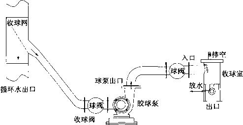 2)各管路和彎頭的安裝按圖1進(jìn)行。收球網(wǎng)的出膠球口必須高于膠球泵入口0.5m及以上;各接口有彎頭過渡連接的,彎頭要大于或等于90。彎徑好大于2.5倍管徑。